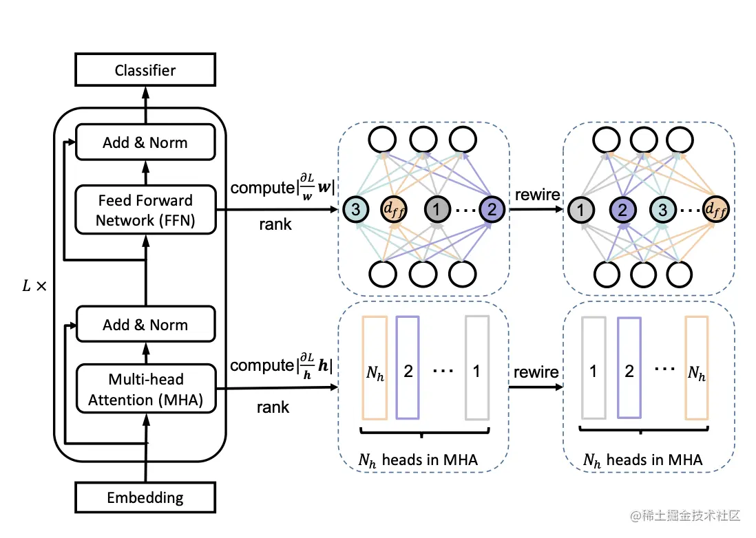 为了充分利用网络的容量,更重要的头部或神经元应该在更多的子网络中共享。因此,在训练宽度自适应网络前,作者在 fine-tuned BERT网络中根据注意力头和神经元的重要性对它们进行了排序,然后在宽度方向上以降序进行排列。这种选取机制被称为 Network Rewiring。