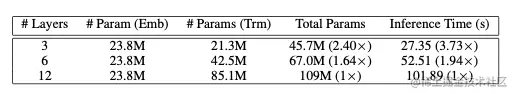 图5展示了BERT3、BERT6、BERT12的推理时间即参数量, 实验表明Patient-KD方法实现了几乎线性的加速,BERT6和BERT3分别提速1.94倍和3.73倍。