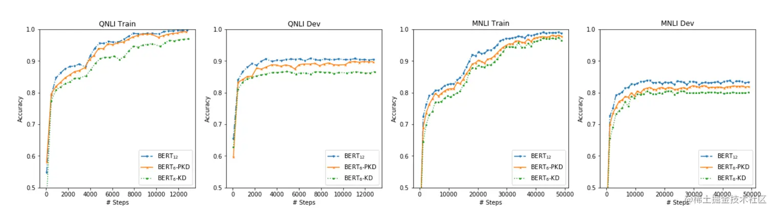 BERT预训练模型对资源的高需求导致其很难被应用在实际问题中,为缓解这个问题,论文中提出了Patient Knowledge Distillation(Patient KD)方法,将原始大模型压缩为同等有效的轻量级浅层网络。同时,作者对以往的知识蒸馏方法进行了调研,如图1所示,vanilla KD在QNLI和MNLI的训练集上可以很快的达到和teacher model相媲美的性能,但在测试集上则很快达到饱和。对此,作者提出一种假设,在知识蒸馏的过程中过拟合会导致泛化能力不良。为缓解这个问题,论文中提出一种“耐心”师生机制,即让Patient-KD中的学生模型从教师网络的多个中间层进行知识提取,而不是只从教师网络的最后一层输出中学习。