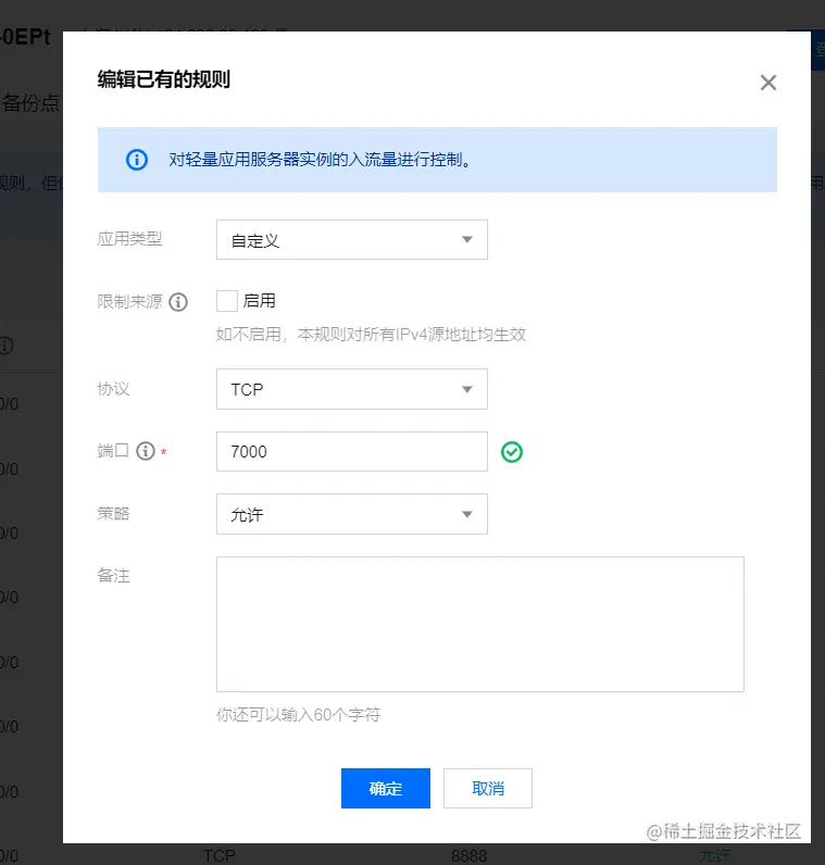[common] server_addr = 124.223.88.139 server_port = 7000 [ssh] type = tcp local_ip = 127.0.0.1 local_port = 22 remote_port = 6000 # 远程桌面连接 [ssh] type = tcp local_ip = 127.0.0.1 local_port = 3389 remote_port = 3389local_ip和local_port配置为本地需要暴露到公网的服务地址和端口。remote_port表示在 frp 服务端监听的端口,访问此端口的流量将会被转发到本地服务对应的端口。 -