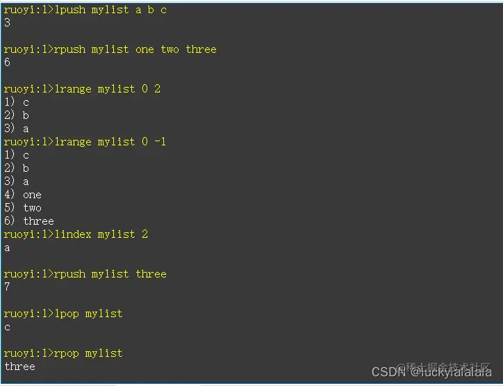 | lrange 键 开始 结束 | 得到键中指定范围的元素的数据 每个元素都有一个索引号,从左向右0 |