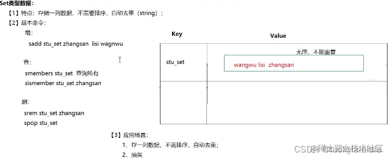 在Redis中,我们可以将Set类型看作为没有排序的字符集合,和List类型一样,我们也可以在该类型的数据值上执行添加、删除或判断某一元素是否存在等操作。Set可包含的最大元素数量是4G,和List类型不同的是,Set集合中不允许出现重复的元素。