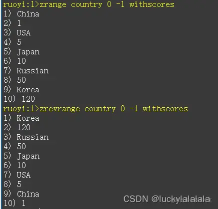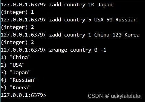 添加键country,分数是1,值是China,分数是120,值是Korea