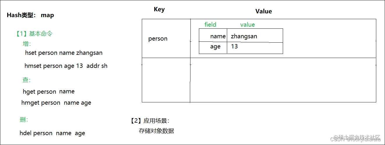 | hdel 键 字段 字段 | 删除一个或多个字段的值 |