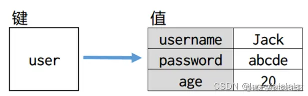 该类型非常适合于存储对象的信息。如一个用户有姓名,密码,年龄等信息,则可以有username、password和age等键。它的存储结构如下: