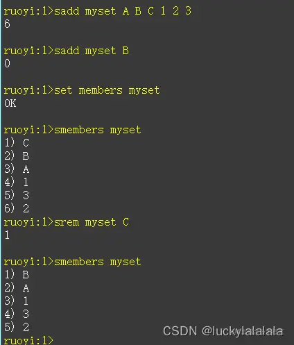 1. 向myset集合中添加A B C 1 2 3 六个元素