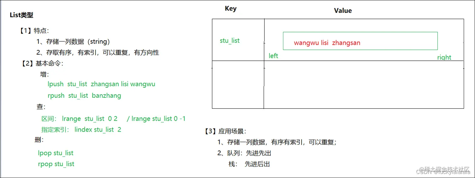 | list | 列表类型,类似于Java中List,元素是存取有序,可以重复。 |
