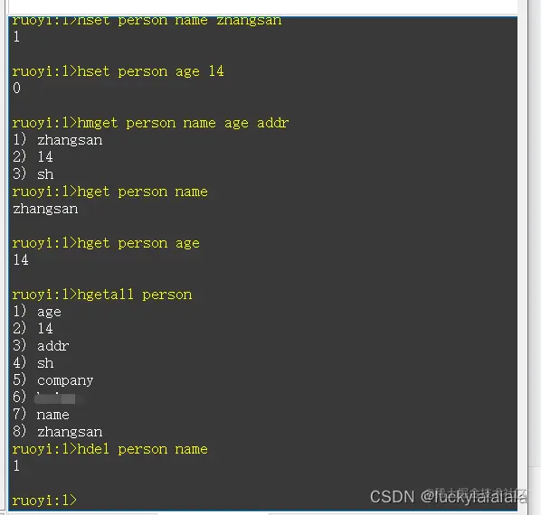 - 创建hash类型的键为person,并且添加一个字段为name,值为zhangsan