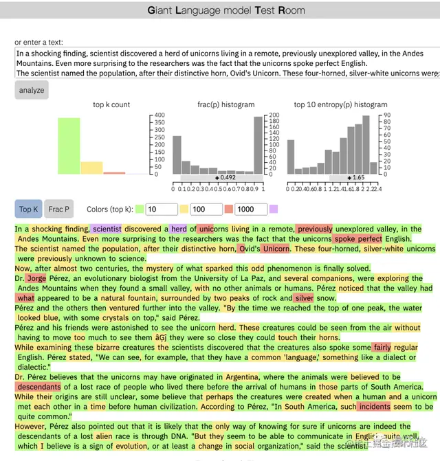 由于输出是模型知道的所有单词排名,根据排名对文本每个单词进行颜色编码,前10名是绿色,前100名是黄色,前1000名是红色,紫色则是不太可能出现的词。