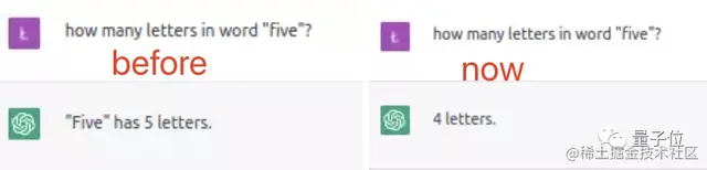 对于“单词‘five’由几个字母组成”这个问题,以前,ChatGPT回答是5。