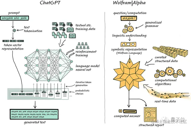 具体而言,就是在ChatGPT上获得自然语言,WolframAlpha将其转化为精确的、符号化的计算语言,并在此基础上发挥它的计算优势。