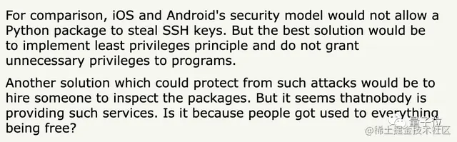 关于SSH密钥,Linux存在一些漏洞,而iOS和Android的安全模型就不会允许Python软件包窃取SSH密钥。
