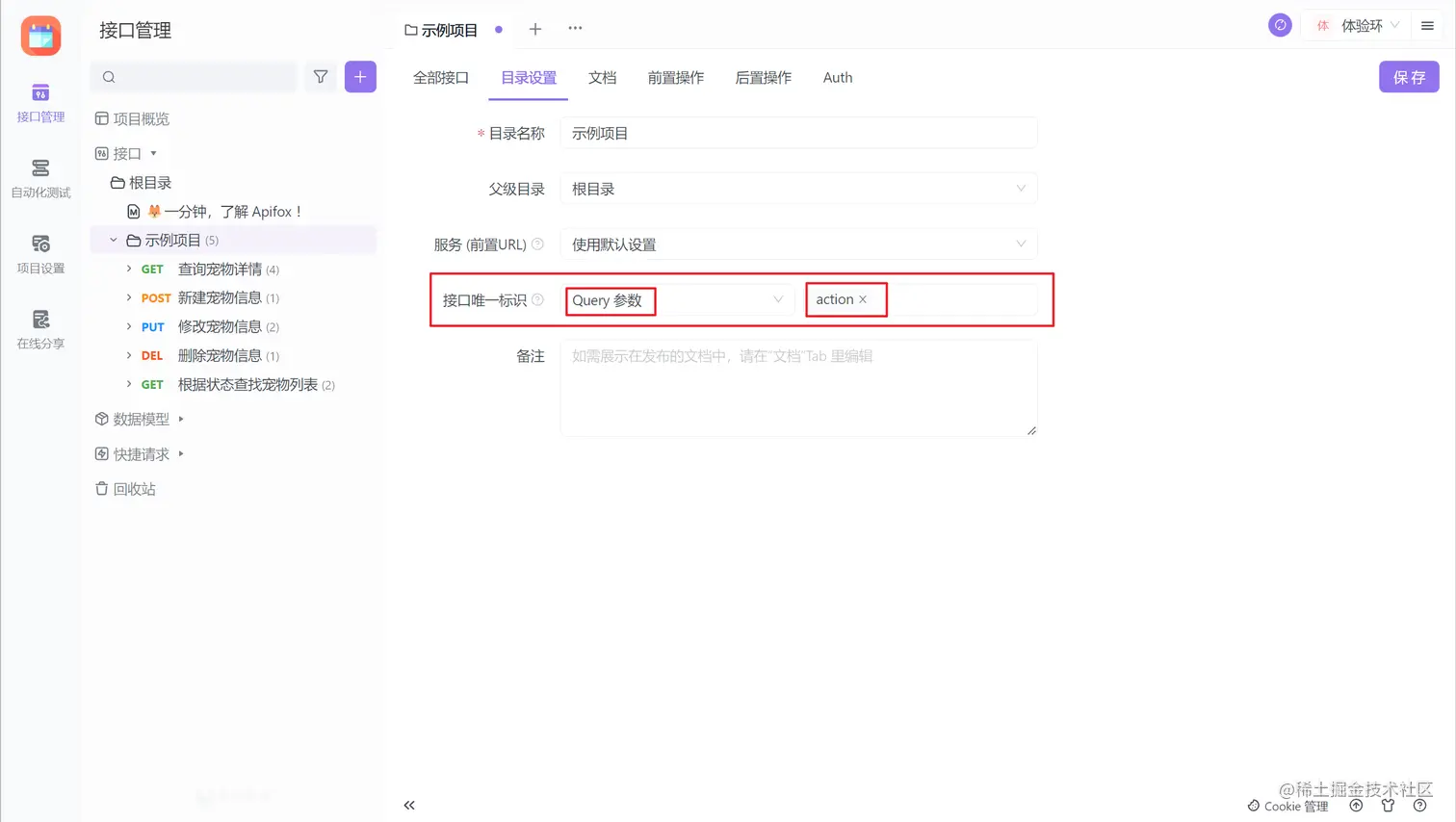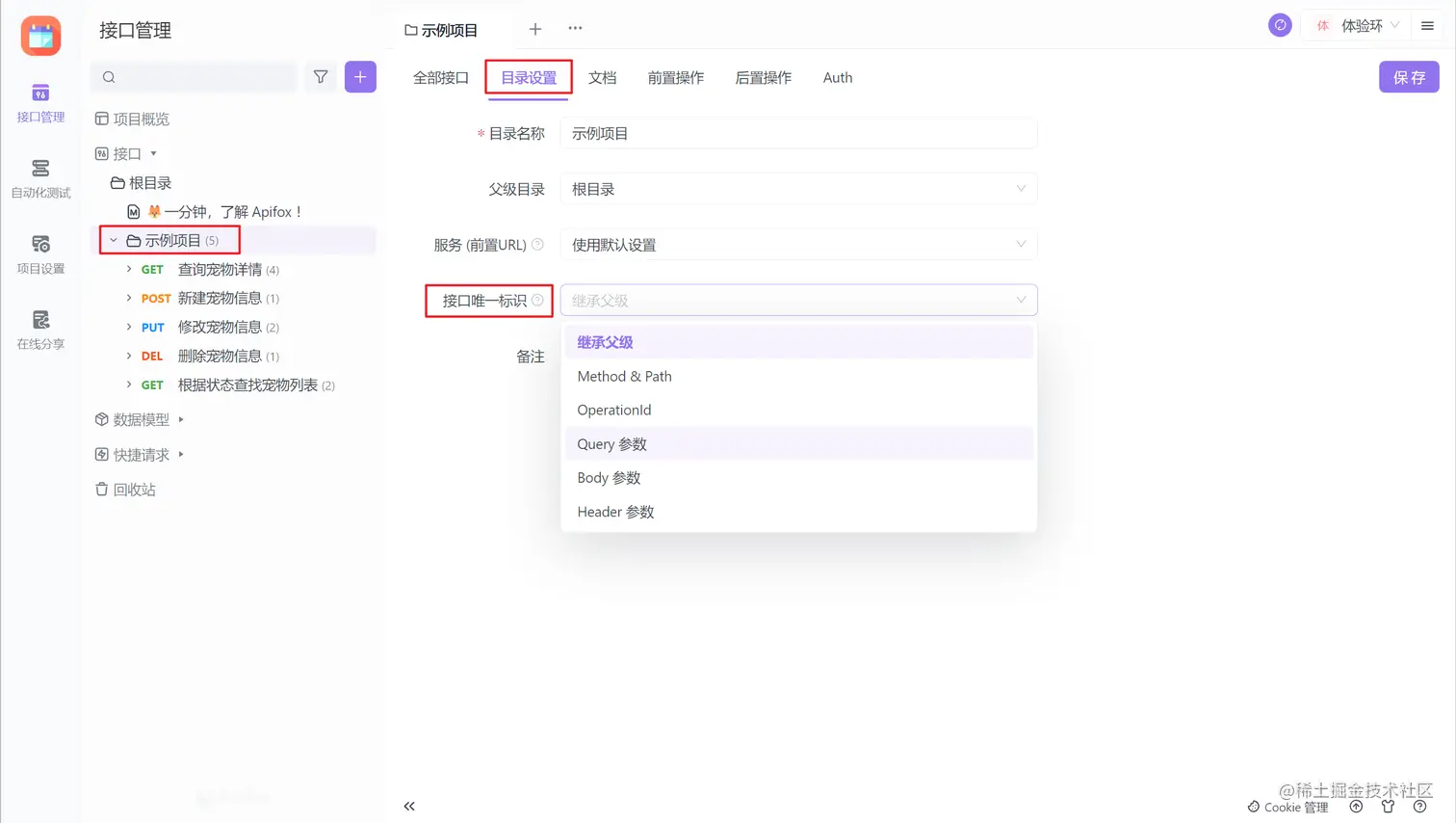 接口唯一标识 在 Apifox 中被定义为目录层级的设置。也就是说,当你需要定义某个接口的唯一标识的时候,需要在该接口的 父级目录 中设置。根据你的项目需求,在目录设置的选项下选择你需要的唯一标识参数,然后点击保存,即可对该目录下的所有接口生效。