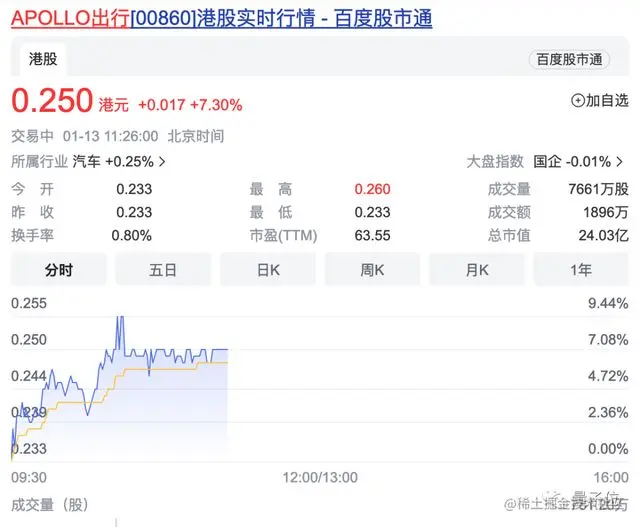 今天开盘后,Apollo智慧出行股价大涨,截至中午收盘涨幅7.3% 。