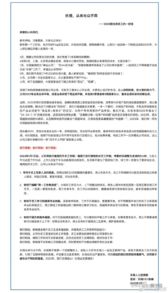 2023年1月1日起,公司将执行每周四天半工作制。