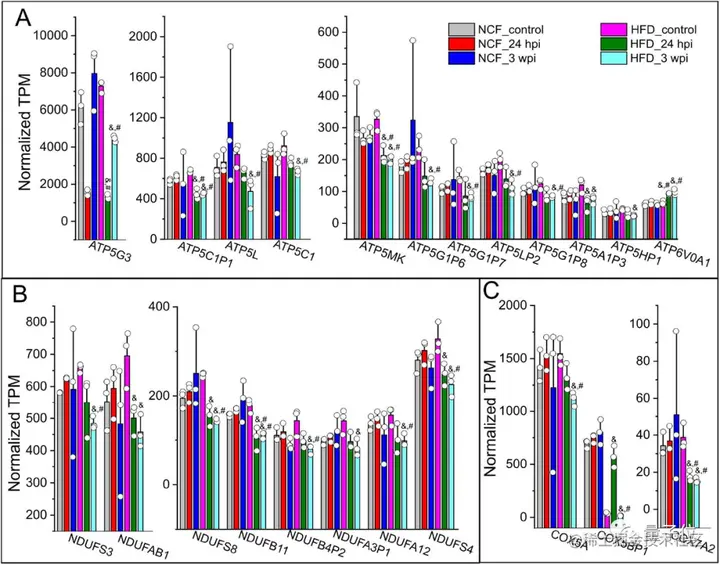 而在表达量减少的基因中,涉及到了线粒体呼吸链 (MRC)的三个基因家族。