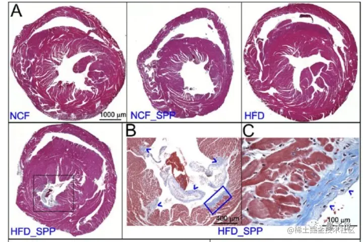 并且在接种病毒6周后,高脂饮食小鼠的心肌已经明显出现纤维化,而正常饮食小鼠没有发现很明显的纤维化。