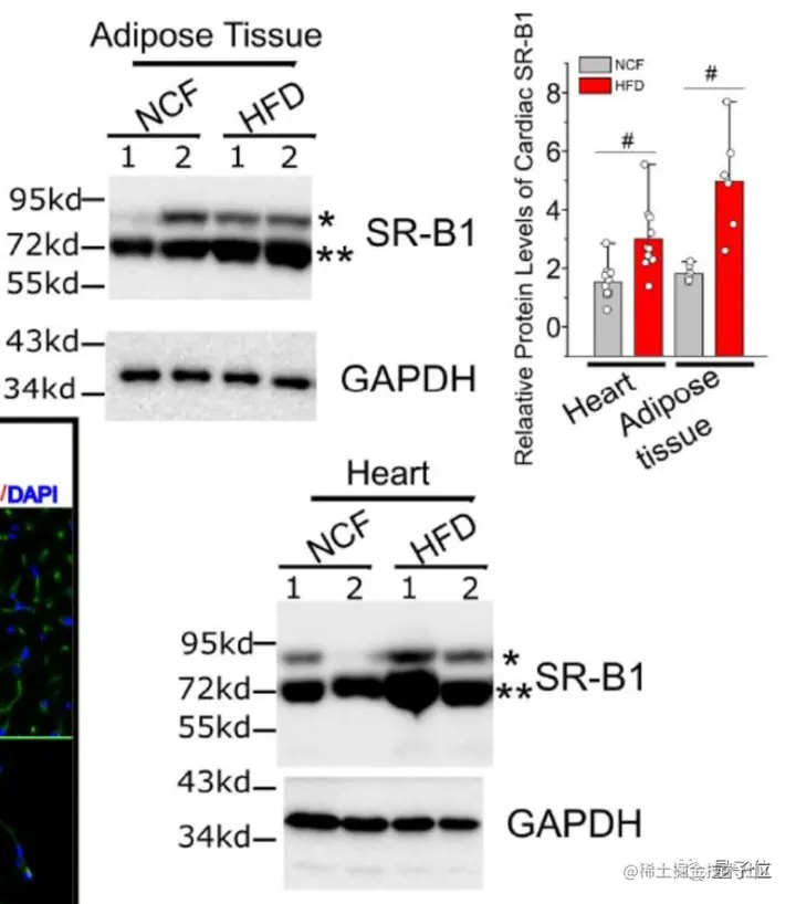 并且,与正常饮食组小鼠相比,高脂饮食组小鼠的心脏、脂肪组织和肾脏细胞SR-B1蛋白水平明显增加,而在肝脏、肺和脾脏细胞却没有增加。