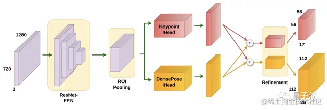 该架构灵感就来自Facebook已经开源的人体姿势实时识别系统DensePose。DensePose入选了2018年CVPR的Oral环节,主要是把2D图像转换成3D人体模型。