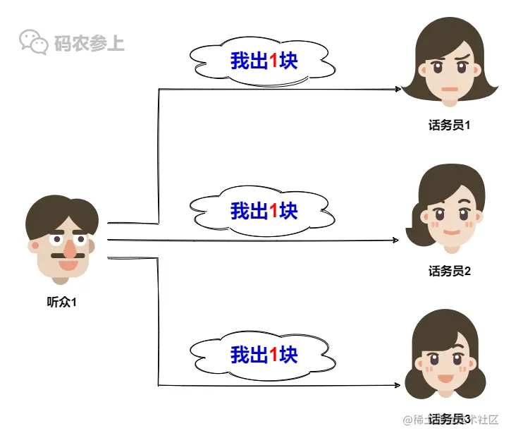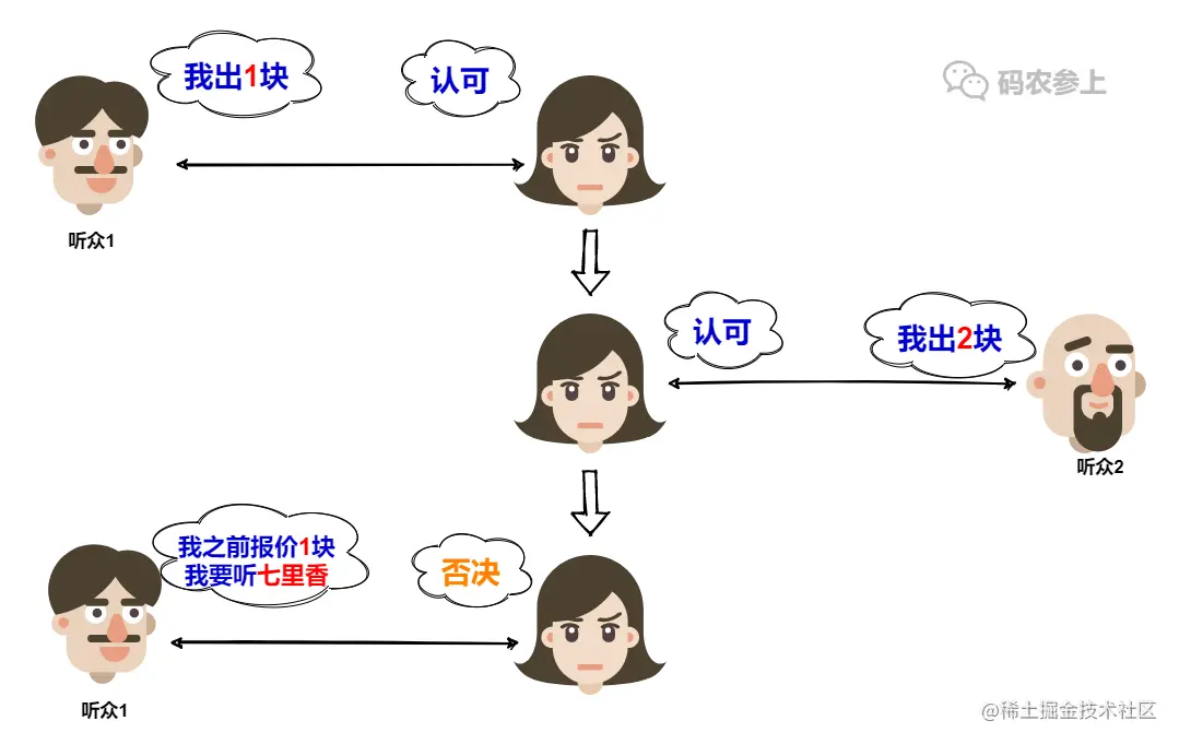 无奈,听众1只能回到第一阶段,从报价开始再重头走一遍流程。并且这次,他把报价提升到了3块。