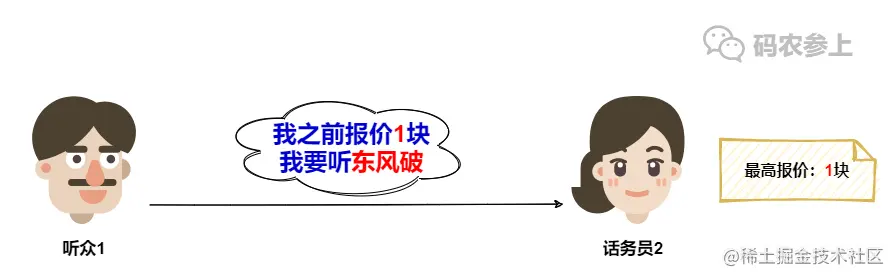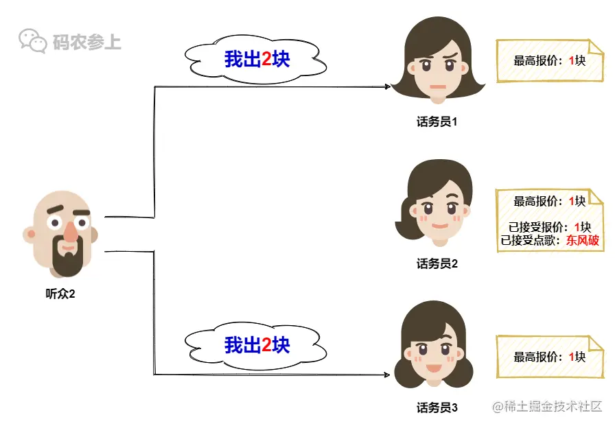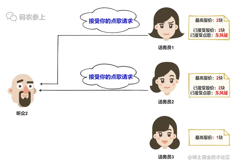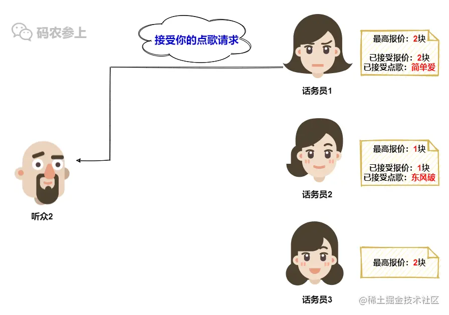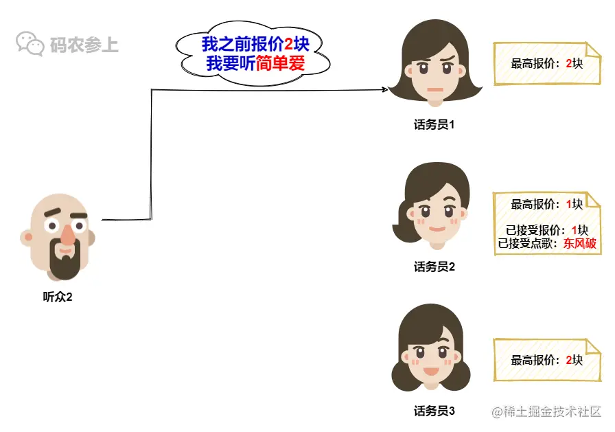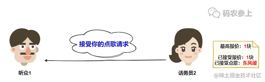 在收到听众1的点歌请求后,话务员2看到听众1在请求中携带的之前报价是1块,满足大于等于自己记录的最大报价这一条件,于是果断接受听众1的点歌请求。
