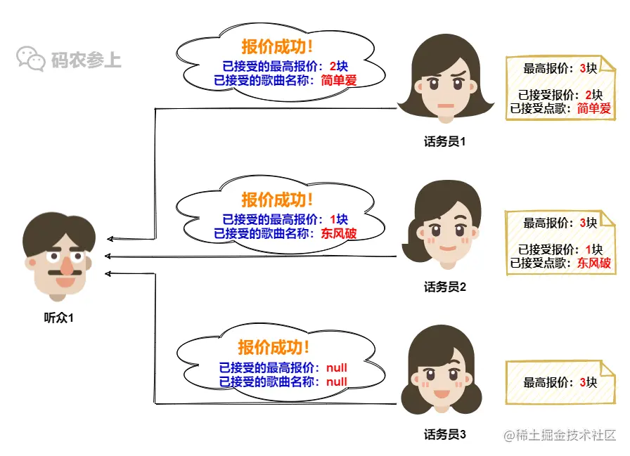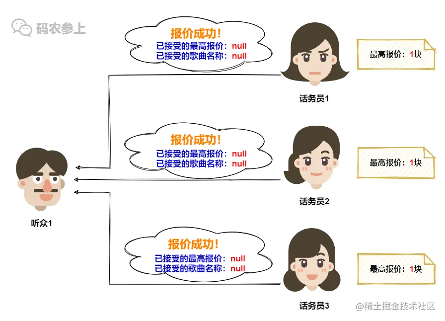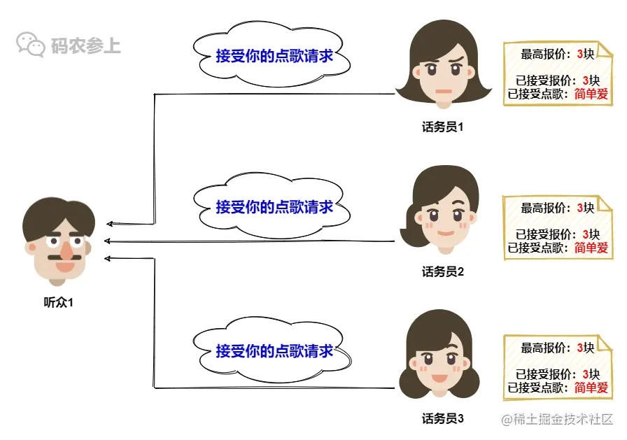 在话务员3这里,她记录的最高报价还是听众1之前的1块,所以没有意外,话务员3会接受听众1的点歌请求,并更新本地的记录信息。