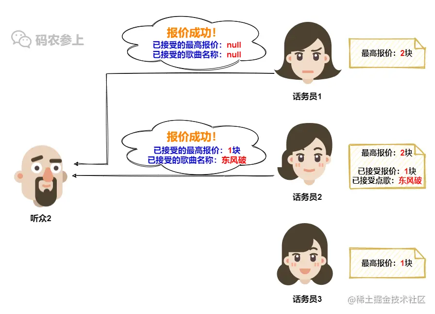 话务员1和话务员2再次比较听众2这次携带的之前报价,均大于等于本地记录的最高报价,所以接受他的点歌请求。在更新本地记录的信息后,回复信息给听众2。