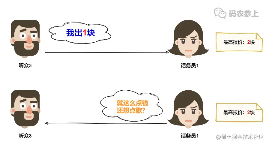 但是话务员1这就不一样了,她所认可的报价已经涨到了2,所以旧的1块钱报价已经不能在她这里点歌了,因此话务员1会拒绝听众1的点歌请求。