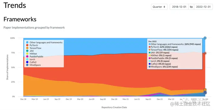 在代码开源的那些论文研究中,单从框架使用率来看,这4年来PyTorch占比正急剧上升。