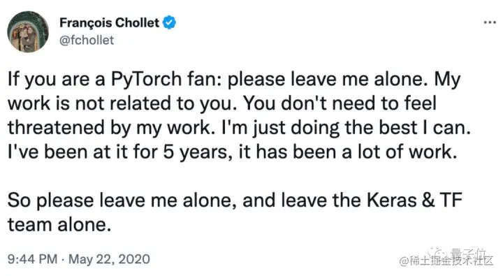 Keras创始人François Chollet,则在这个话题中投了TensorFlow一票,当时他认为PyTorch会走向下坡路。