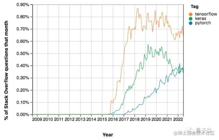 好奇哪种框架目前关注度更高,她便对Stack Overflow上3种主流框架Keras、TensorFlow和PyTorch进行了一个统计: