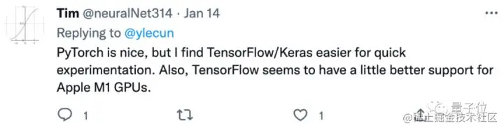 但也有尝试过好几种框架的网友表示:TensorFlow和Keras做快速实验更方便,而且TensorFlow看起来对Apple M1 GPU支持更好。