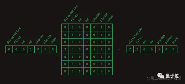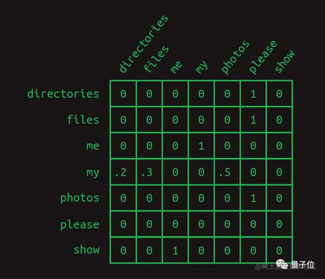 以my为例,要想知道它的下一个单词的概率,可以创建一个my的独热向量,乘上面的转移矩阵便能得出了