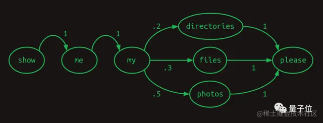 可以用下面这个流程图(马尔可夫链)来表示,箭头上的数字表示下一个单词出现的概率。