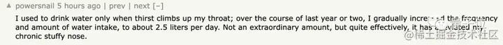 以前只有口渴才喝,最近一两年里增加了喝水频率和总量,一天约2.5升,最后居然缓解了慢性鼻塞。