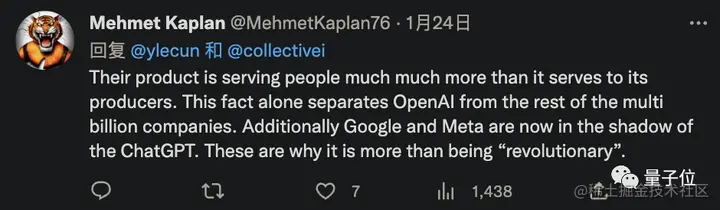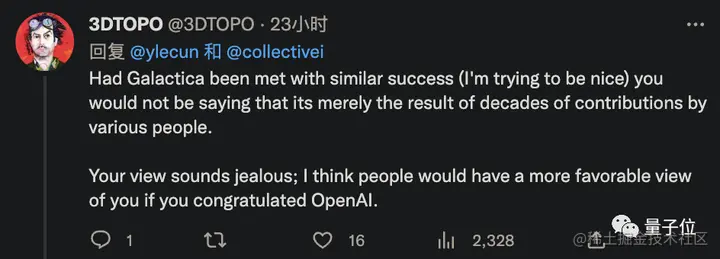 “如果Galactica(Meta的语言模型)也获得了类似ChatGPT的成功,你就不会说这仅仅是几十年来各种人的贡献的结果。你的观点听起来让人觉得是你很嫉妒。我认为如果你能衷心祝贺OpenAI,大家可能还会对你赞许有加。”
