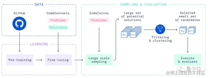 AlphaCode由DeepMind打造,基于Transformer模型打造,通过采用GitHub中715.1GB的代码进行预训练,并从Codeforces中引入一个数据集进行微调,随后基于Codecontests数据集进行模型验证,并进一步改善了模型输出性能。