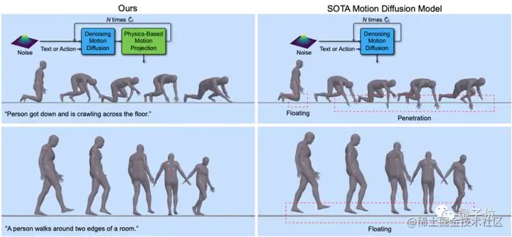 PhysDiff是英伟达推出的人体运动生成扩散模型,进一步解决了AI人体生成中漂浮、脚滑或穿模等问题,教会AI模仿使用物理模拟器生成的运行模型,并在大规模人体运动数据集上达到了最先进的效果。