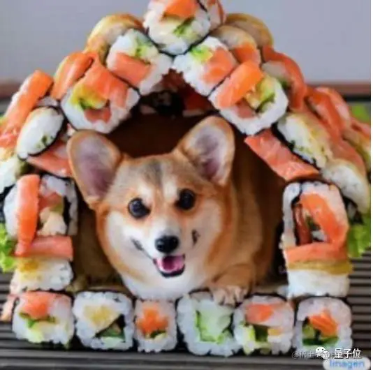 下图是Imagen根据“一只可爱的柯基住在寿司做的房子里”生成的图像: