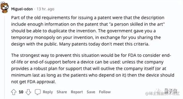 还有人建议,申请专利时,创业公司理应附带提交一份支持计划,保证患者们长期能获得设备维修及零件更换,否则,监管部门不应该批准其专利通过。
