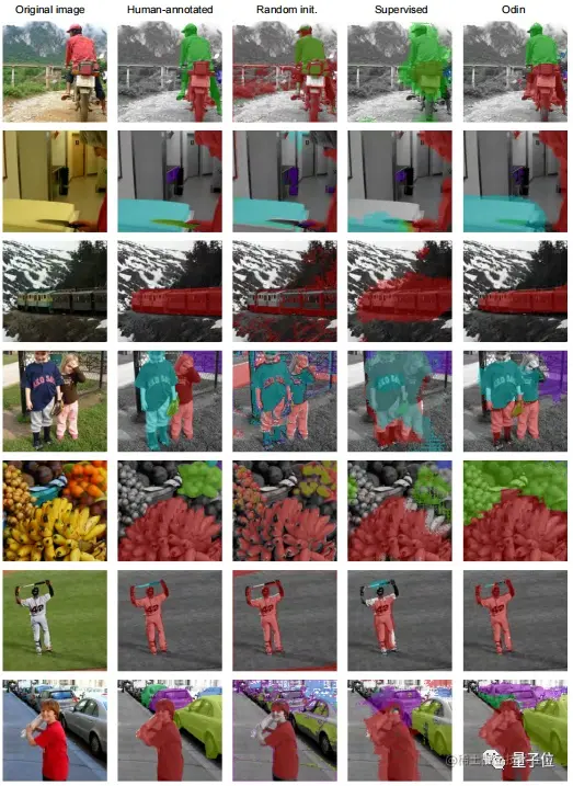 将使用Odin生成的分割图像与随机初始化的网络(第3列),ImageNet监督的网络(第4列)中获得的分割图像进行比较。