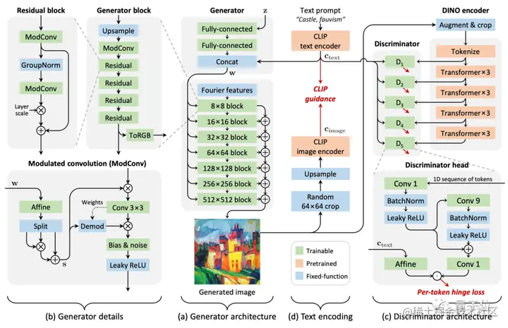 具体到细节上,作者们对生成器、判别器和文本对齐权衡机制进行了重新设计,用FID对样本质量进行量化评估,并采用CLIP来对文本进行对齐。