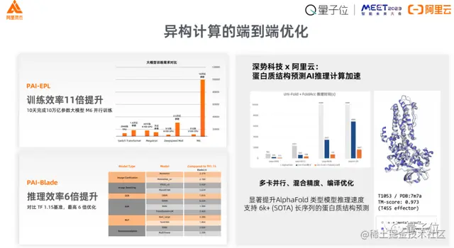 在优化领域,我们的框架PAI-Blade,能够帮助算法工程师在面对底层硬件时不需要去担心,比如CPU、GPU、非常多的创新建设出来的国产芯片等等,我们可以用这种方式更有效地提升算法效率。