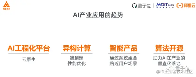 - 目前AI产业应用有四个趋势:云原生的AI工程化平台、端到端优化的异构计算体系、通过系统组合打造贴近用户的智能产品,以及算法的开源助力AI在垂直产业的广泛应用。
