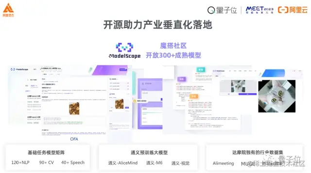 今年达摩院和业界很多伙伴一起推出了ModelScope,我觉得它跟以前所见到的学术模型不一样,我们更进一步的地方是我们将实际业务当中所见到的、训练的、沉淀下来的实际场景化的模型都贡献了出来,今天大家可以在魔搭上面找到300多个成熟的模型。