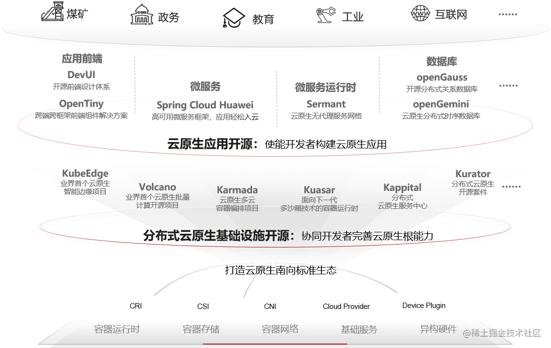 - 云原生应用开源:包括前端、微服务框架、运行性组件、数据库等华为云自用核心部件,旨在使能企业、开发者快速构建服务化、极致体验、安全可靠、智能高效的现代化应用,实现业务敏捷、高效创新,丰富云原生应用生态,促进数字化转型。