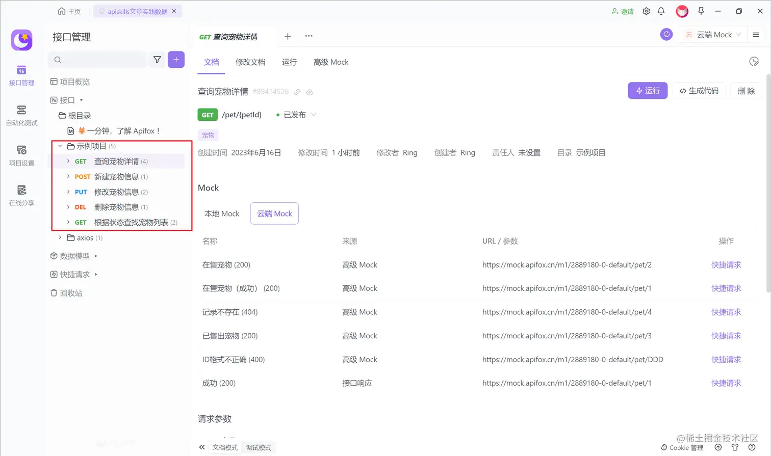 为了更方便接口的测试,这里使用 Apifox 的示例项目里提供的 Mock 数据。你可以访问 Apifox 的官网,下载后新建一个项目,即可进行调用。