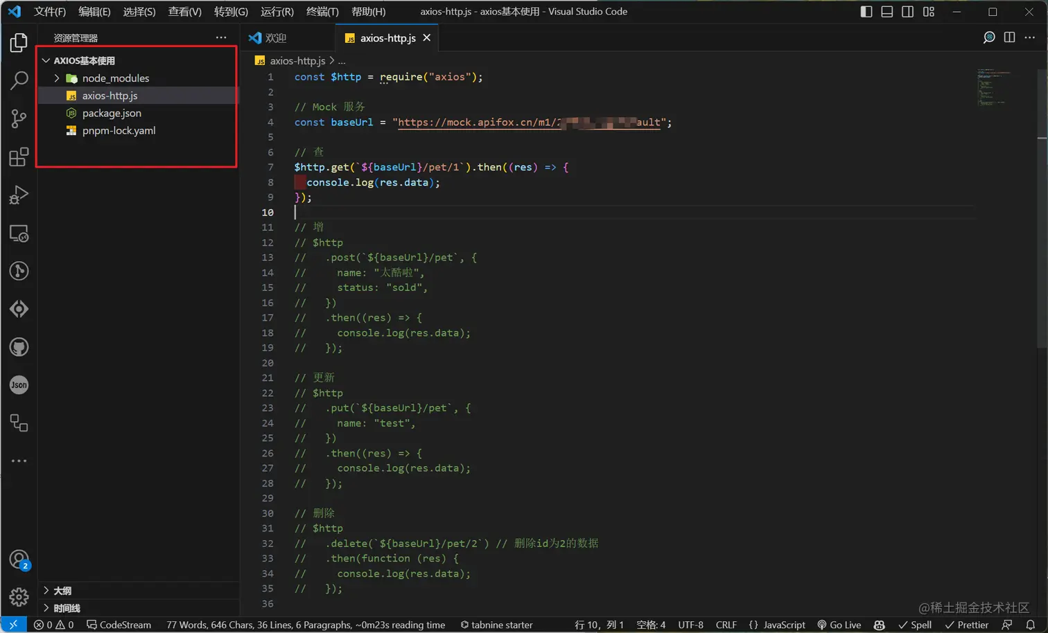 以上介绍了 Axios 的基本使用,在前端工程化项目中,它经常会被单独封装,以方便前端开发人员的调用,要进一步学习可访问 Axios 的官网。另外,在后端人员还没开发好接口时,通常会使用 Mock 数据来测试业务,Apifox 提供的高级 Mock 功能很好的解决了这个需求,极大地方便了后续工作的开展。