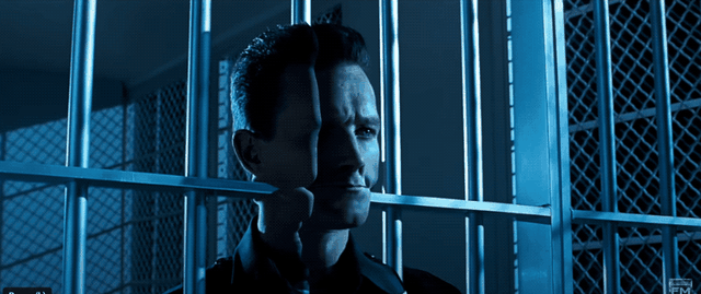 《终结者2》中,液态金属机器人T1000变形穿过铁栅栏,追杀主角。