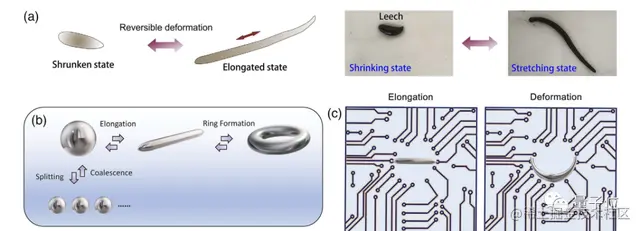 液体形态时,由于磁性微粒能够旋转和重新定向它们的磁极,该机器人可以自由实现伸长、分裂和合并。